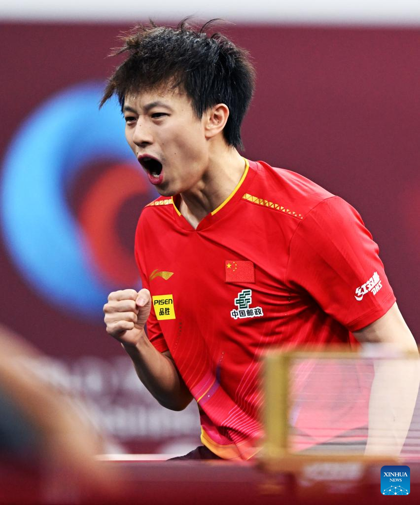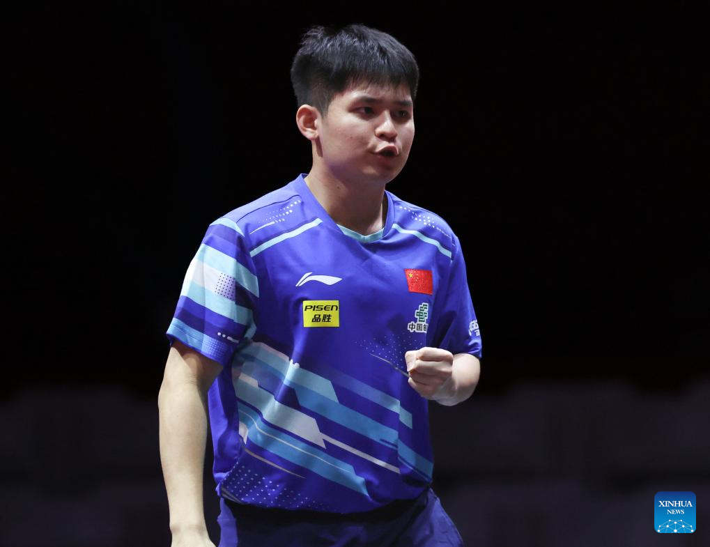 Lin Gaoyuan celebrates scoring during the men's singles round of 128 match between Lin Gaoyuan of China and Youssef Abdelaziz of Egypt at ITTF World Table Tennis Championships Finals Doha 2025 in Doha, Qatar, May 18, 2025. (Xinhua/He Changshan)