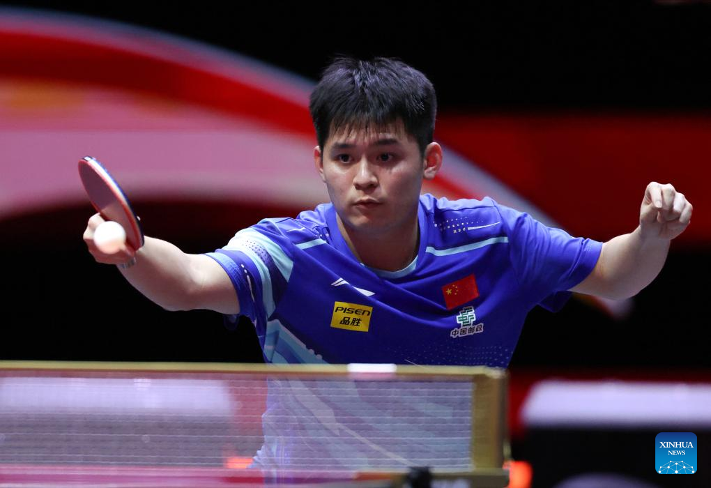 Lin Shidong hits a return during the men's singles round of 128 match between Lin Shidong of China and Liam Pitchford of England at ITTF World Table Tennis Championships Finals Doha 2025 in Doha, Qatar, May 18, 2025. (Xinhua/Liu Xu)