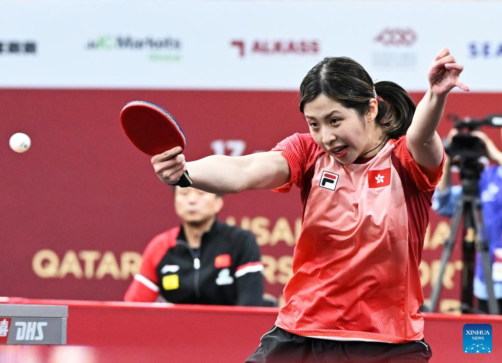 Lam Yee Lok hits a return during the women's singles round of 128 match between Shi Xunyao of China and Lam Yee Lok of China's Hongkong at ITTF World Table Tennis Championships Finals Doha 2025 in Doha, Qatar, May 18, 2025. (Xinhua/He Changshan)