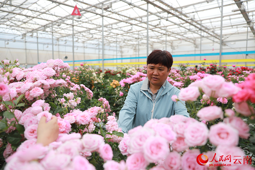 A technician checks on the growth of a new variety of China roses at the international flower technology innovation center in Dounan, Kunming, capital of southwest China's Yunnan Province. (People's Daily Online/Li Faxing)