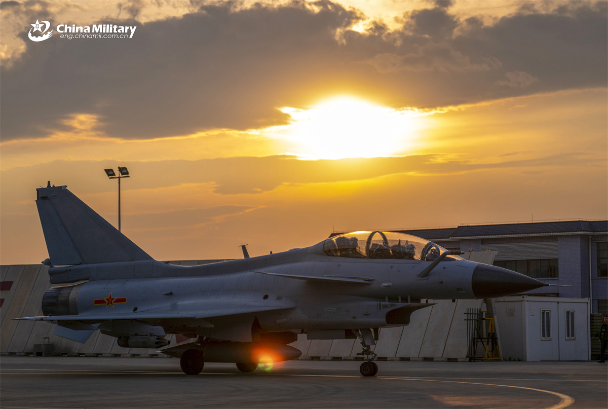 Maintenance men assigned to an aviation brigade of the air force under the Chinese PLA Southern Theater Command and a J-10 fighter jet are captured in the same frame during a day-and-night flight training exercise. (eng.chinamil.com.cn/Shang Jieyan)