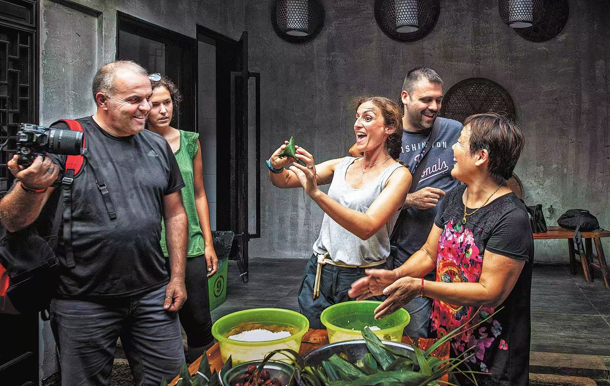 German visitors make zongzi in Taicang in 2018. (Photo/China Daily)
