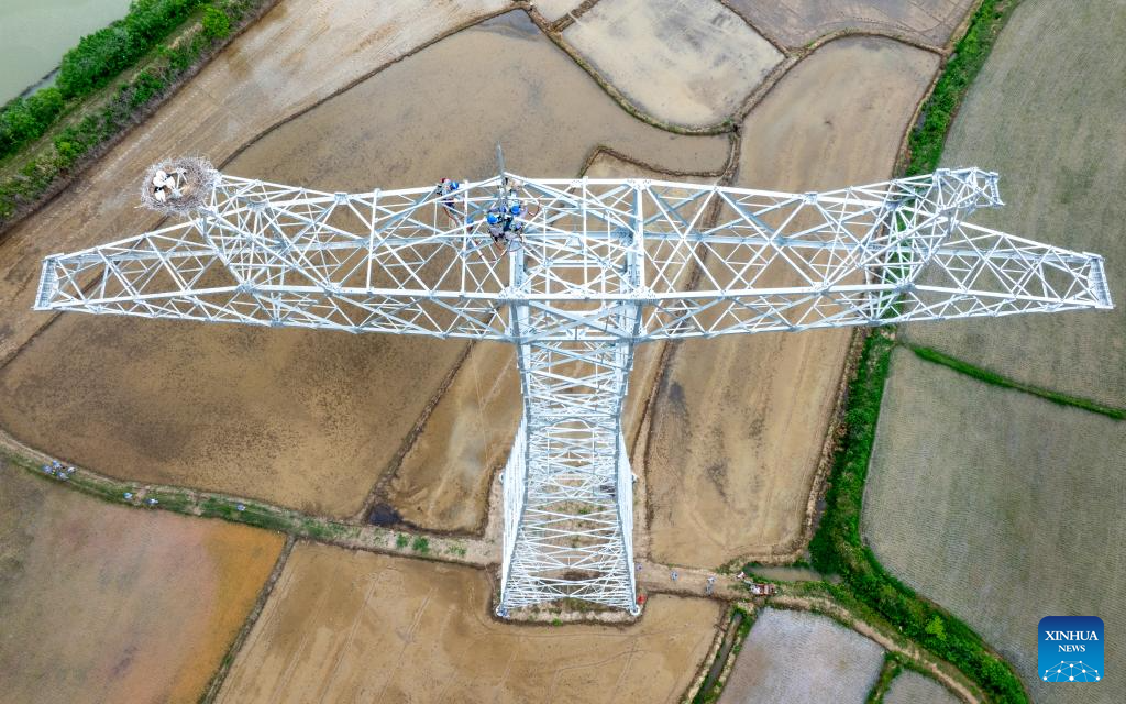 An aerial drone photo taken on May 20, 2025 shows workers of State Grid Anhui Electric Power Co., Ltd. installing a camera near the nest of oriental white storks in Huoqiu County, east China's Anhui Province. In early May this year, workers discovered a nest of oriental white stork, a migratory bird under first-class state protection, on the newly-built transmission tower. The State Grid Anhui Electric Power Co., Ltd. has installed high-definition cameras near the nest, assigned designated staff to track and protect the oriental white storks, and postponed the construction progress according to the breeding timeline of the storks. (Photo by Zheng Xianlie/Xinhua)