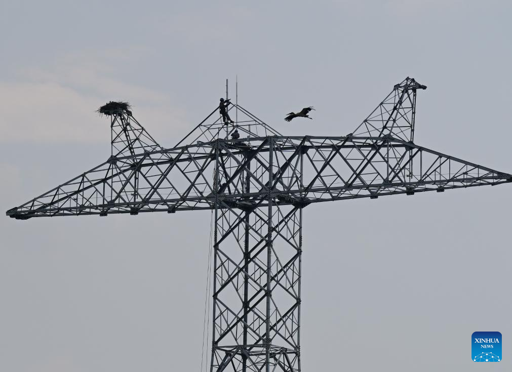 Workers of State Grid Anhui Electric Power Co., Ltd. install a camera near the nest of oriental white storks in Huoqiu County, east China's Anhui Province, May 20, 2025. In early May this year, workers discovered a nest of oriental white stork, a migratory bird under first-class state protection, on the newly-built transmission tower. The State Grid Anhui Electric Power Co., Ltd. has installed high-definition cameras near the nest, assigned designated staff to track and protect the oriental white storks, and postponed the construction progress according to the breeding timeline of the storks. (Xinhua/Zhou Mu)