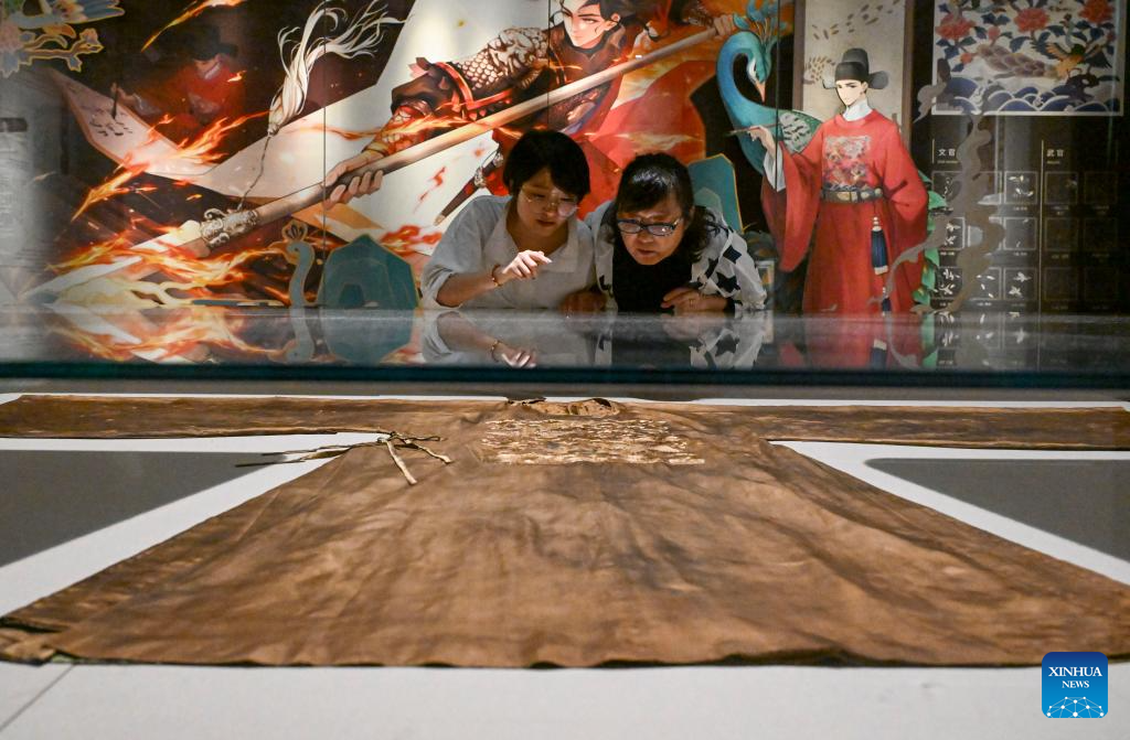 Suzhou Silk Museum staff members Chen Yanlu (L) and Meng Xiaochou arrange a silk garment dating back to the Ming Dynasty (1368-1644) in Suzhou, east China's Jiangsu Province, May 18, 2025. Restoration of this cultural relic has been ongoing for more than three months. (Xinhua/Li Bo)