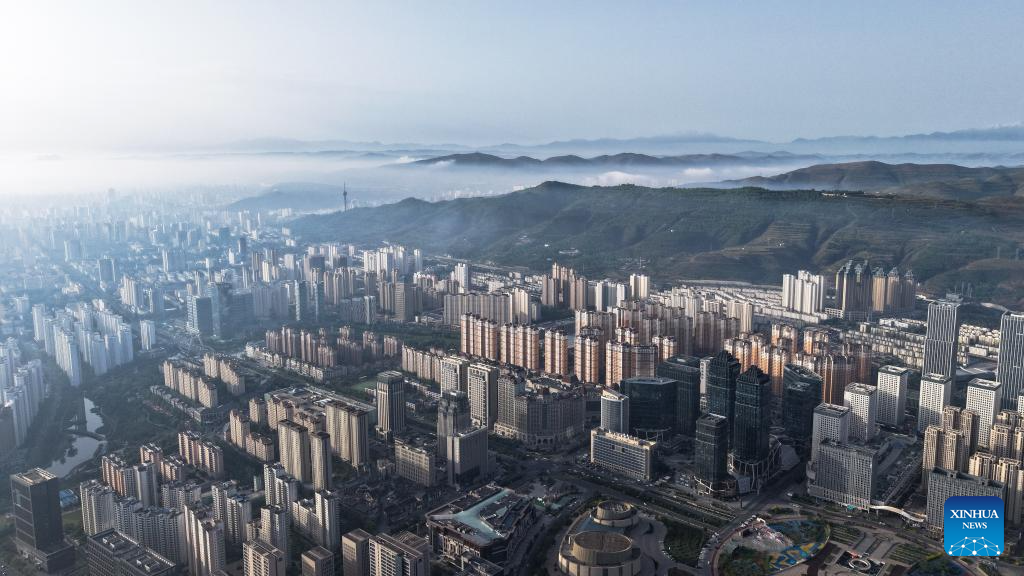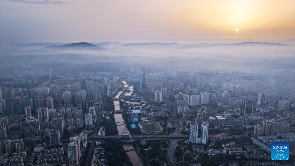 A panoramic aerial drone photo taken on May 22, 2025 shows the sunrise scenery in Xining, northwest China's Qinghai Province. (Xinhua/Qi Zhiyue)