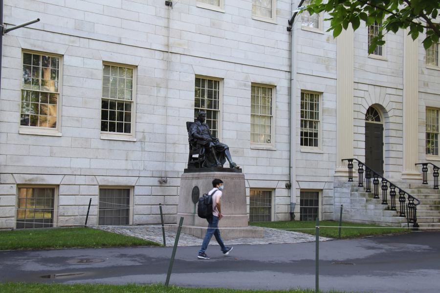 A student walks on the campus of Harvard University in Cambridge of Massachusetts, the United States, on July 14, 2020. (Photo by Fan Lin/Xinhua)
