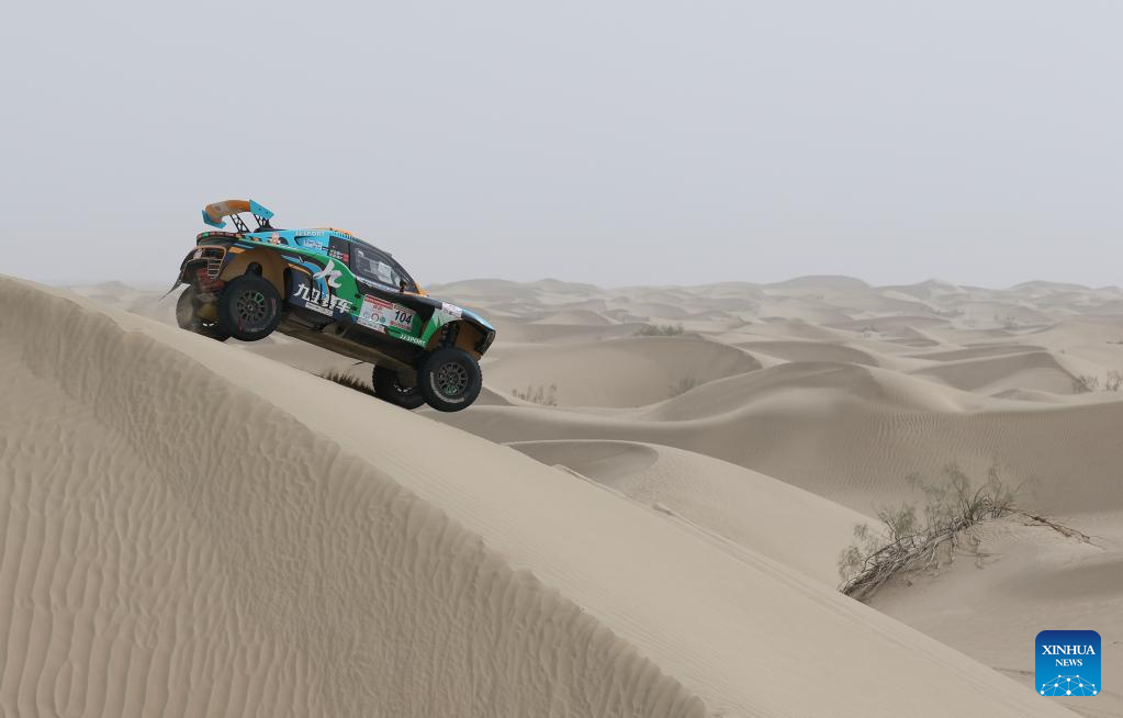 A drone photo shows driver Sun Xiangyan and co-driver Ma Xin compete during stage 2 of the 2025 Taklimakan Rally in Alaer, northwest China's Xinjiang Uygur Autonomous Region, May 22, 2025. (Xinhua/Hu Xingyu)