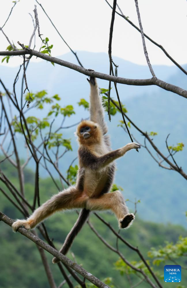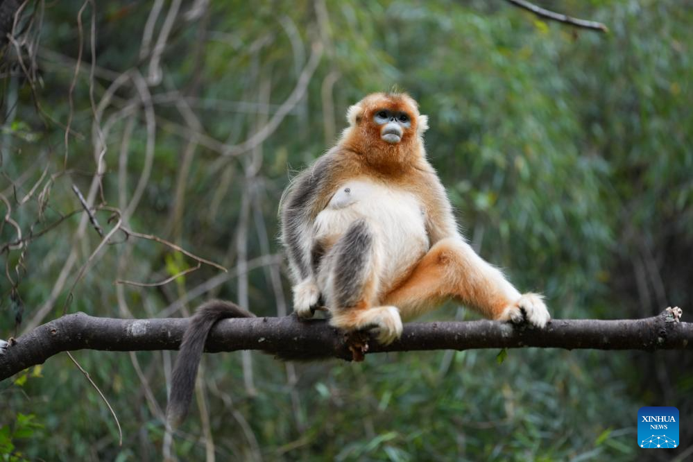 Golden snub-nosed monkeys are pictured in the Pingwu Sichuan golden snub-nosed monkey popular science education base in Pingwu County, Mianyang City of southwest China's Sichuan Province, May 21, 2025. Located within the Xiaohegou Nature Reserve, a provincial-level nature reserve in Sichuan Province, Pingwu Sichuan golden snub-nosed monkey popular science education base is home to over 40 Sichuan golden snub-nosed monkeys. According to the latest monitoring data of 2024, Xiaohegou Nature Reserve is the habitat of about 1,000 Sichuan golden snub-nosed monkeys. (Xinhua/Jiang Hongjing)