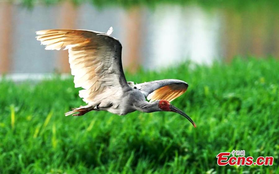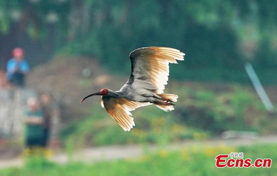 A crested ibis, an endangered bird species once believed to be extinct in China, is released into the wild at Muchuan County, southwest China's Sichuan Province, May 22, 2025. (China News Service/An Yuan)