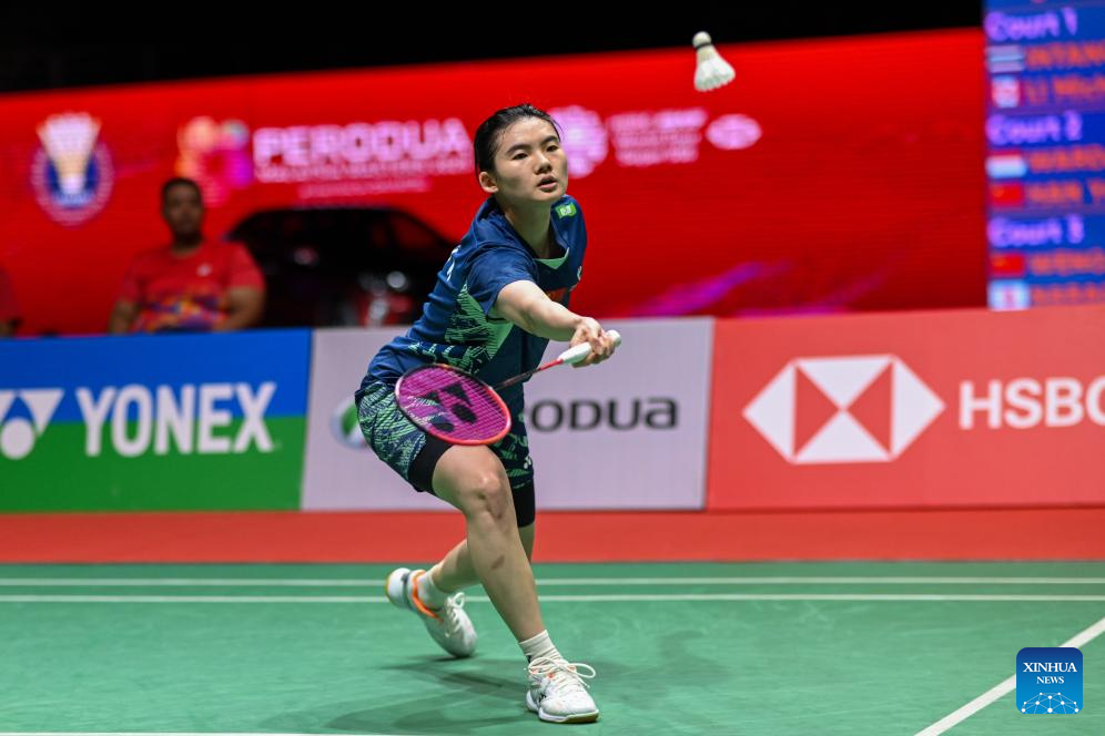 Han Yue of China hits a return during the women's singles quarterfinal against Putri Kusuma Wardani of Indonesia at the Malaysia Masters 2025 badminton tournament in Kuala Lumpur, Malaysia, May 23, 2025. (Photo by Chong Voon Chung/Xinhua)
