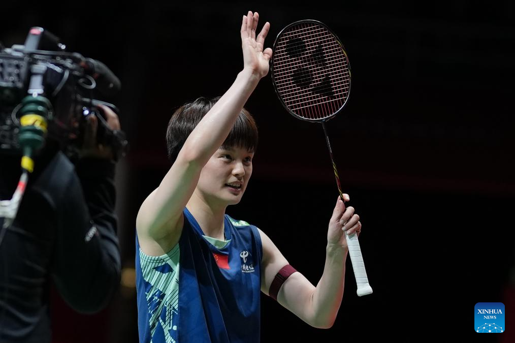 Wang Zhiyi of China celebrates after winning the women's singles quarterfinal against Nguyen Thuy Linh of Vietnam at 2025 Malaysia Masters badminton tournament in Kuala Lumpur, Malaysia, May 23, 2025. (Xinhua/Jia Haocheng)