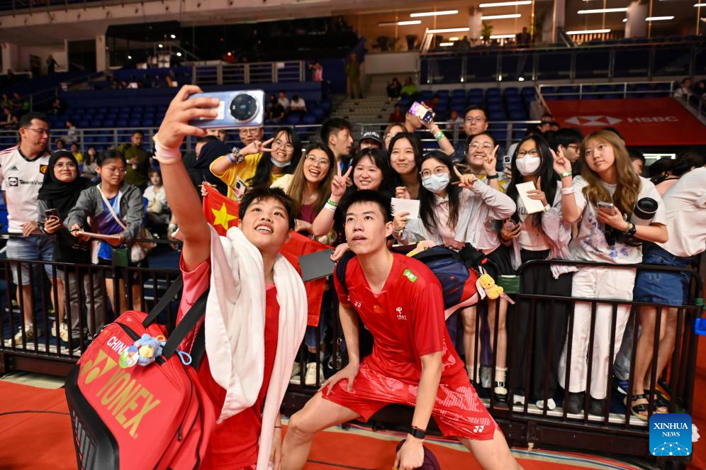 Feng Yanzhe(front R)/Huang Dongping (front L) of China take selfie with fans after the mixed doubles quarterfinal against Dechapol Puavaranukroh/Supissara Paewsampran of Thailand at 2025 Malaysia Masters badminton tournament in Kuala Lumpur, Malaysia, May 23, 2025. (Photo by Chong Voon Chung/Xinhua)