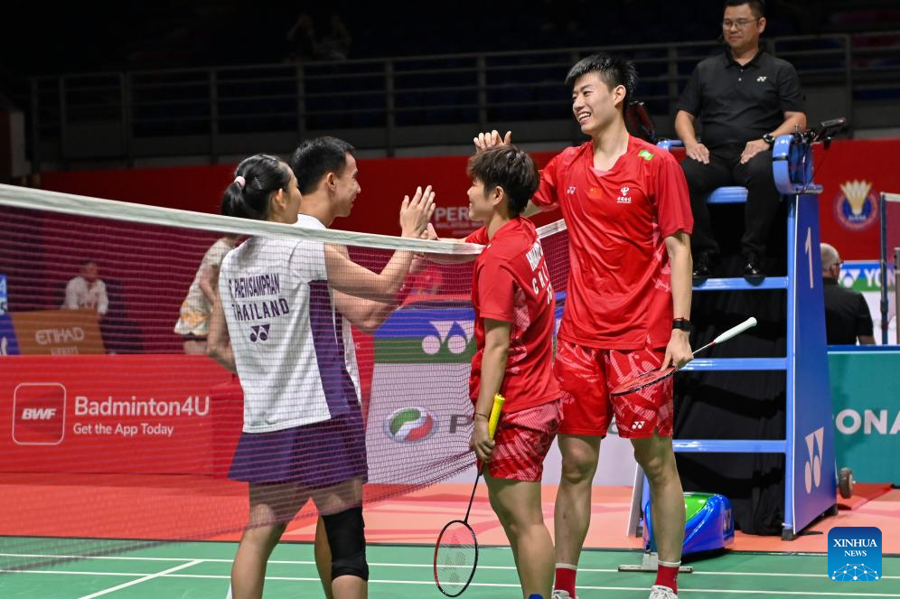 Feng Yanzhe(2nd R)/Huang Dongping (3rd R) of China greet Dechapol Puavaranukroh/Supissara Paewsampran(1st L) of Thailand after their mixed doubles quarterfinal at 2025 Malaysia Masters badminton tournament in Kuala Lumpur, Malaysia, May 23, 2025. (Photo by Chong Voon Chung/Xinhua)