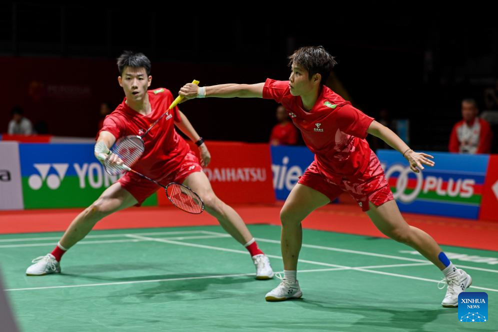 Feng Yanzhe/Huang Dongping (R) of China compete during the mixed doubles quarterfinal against Dechapol Puavaranukroh/Supissara Paewsampran of Thailand at 2025 Malaysia Masters badminton tournament in Kuala Lumpur, Malaysia, May 23, 2025. (Photo by Chong Voon Chung/Xinhua)