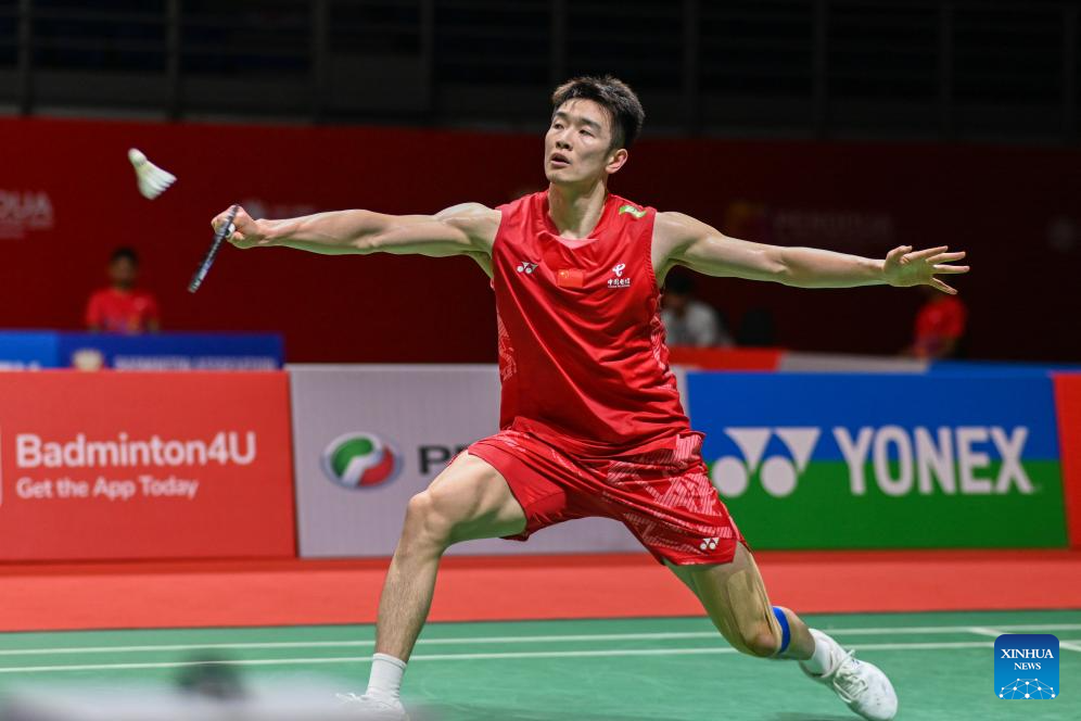 Li Shifeng of China hits a return during the men's singles quarterfinal against Ng Ka Long Angus of China's Hong Kong at 2025 Malaysia Masters badminton tournament in Kuala Lumpur, Malaysia, May 23, 2025. (Photo by Chong Voon Chung/Xinhua)
