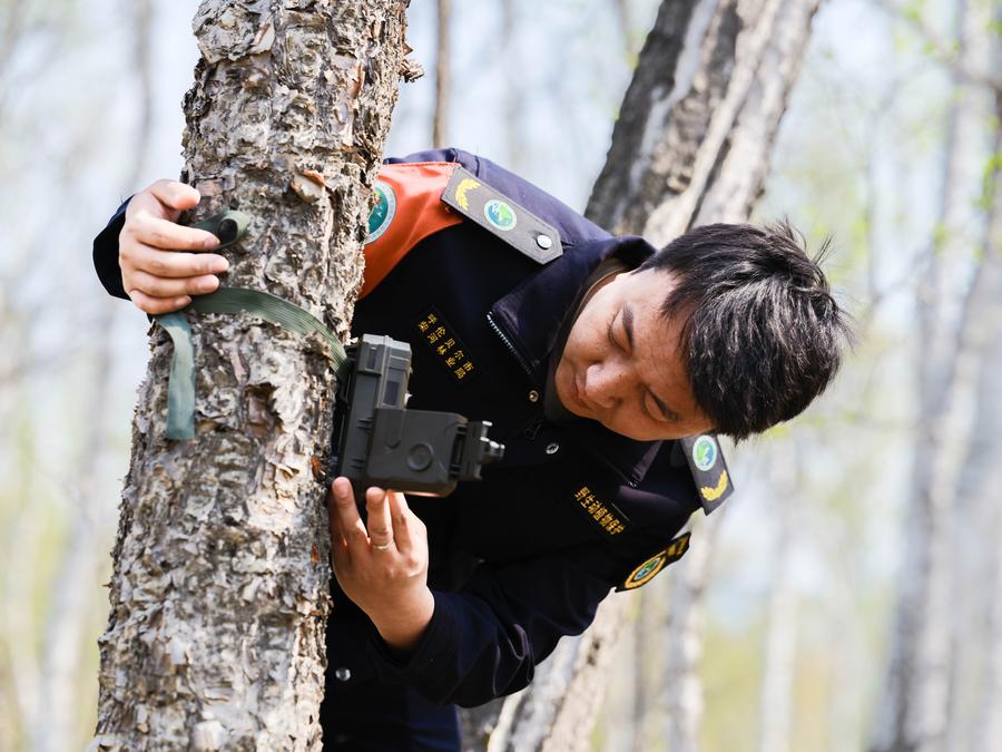Forest ranger Yi Mingzhe equips a tree with an infrared camera at Chaihekou Forest Farm in Zhalantun City, north China's Inner Mongolia Autonomous Region, May 21, 2025. The Baimaogou and Chaihekou forest farms, managed by Inner Mogonlia's Chaihe Forestry Bureau, form a crucial biodiversity hub on the southern slopes of the Greater Khingan Mountains. Currently, the area is home to nine national first-class protected animals, 17 national second-class protected animals and a variety of rare plants. (Xinhua/Ma Jinrui)