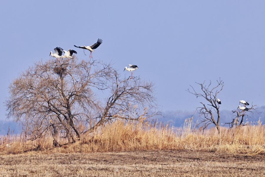 Oriental white storks are pictured at the Bachadao National Nature Reserve in Tongjiang, northeast China's Heilongjiang Province, April 19, 2025. (Photo by Liu Wanping/Xinhua)