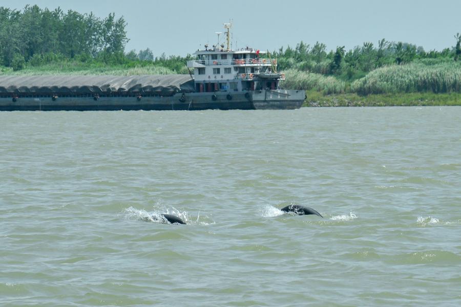Wild finless porpoises leap out of the water on Tongling section of the Yangtze River in east China's Anhui Province, May 21, 2025. (Photo by Chu Zhuchuan/Xinhua)