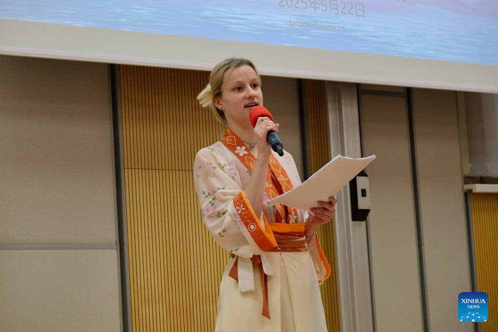 A contestant participates in the Czech national qualifications for the 24th "Chinese Bridge," the Chinese language proficiency competition for foreign college students in Prague, the Czech Republic, May 22, 2025. (Xinhua/Deng Yaomin)