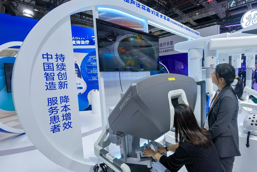A visitor tries a surgery robot at the booth of Fosunpharma at the Medical Equipment & Healthcare Products Exhibition Area during the 7th China International Import Expo (CIIE) in east China's Shanghai, Nov. 8, 2024. (Xinhua/Zhang Cheng)
