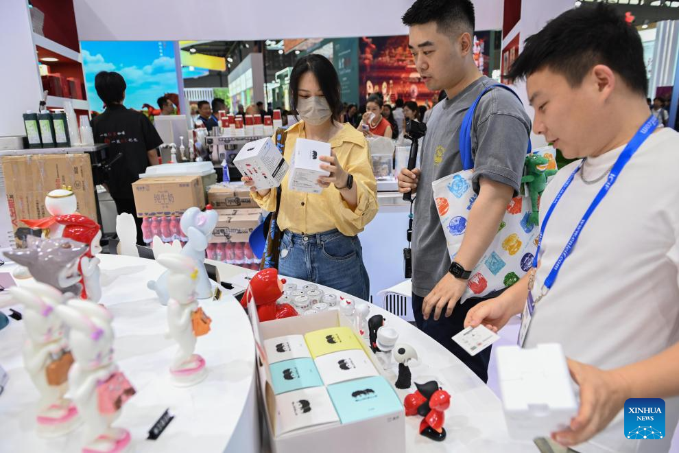 The five-day event is being held across eight exhibition halls -- three comprehensive spaces and five specialized areas. The specialized halls cover a broad array of fields, including international cultural trade, cultural tourism, art and design, film and gaming, and intangible cultural heritage. (Xinhua/Liang Xu)