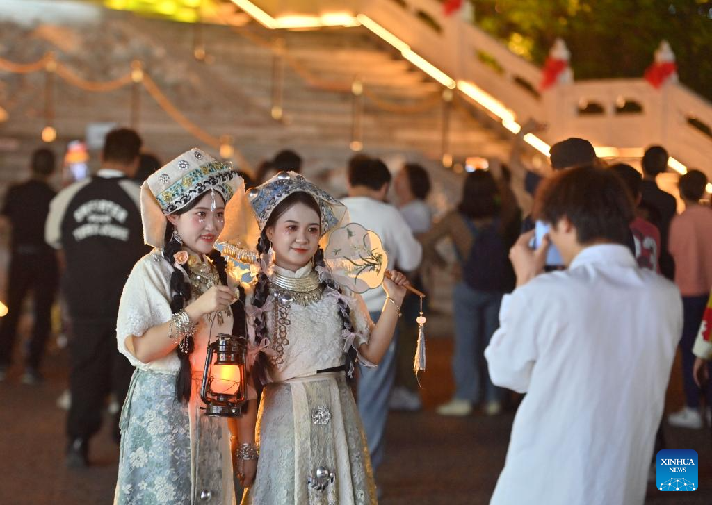 Tourists take photos at Mengwu Miao Village in Rongshui Miao Autonomous County of Liuzhou City, south China's Guangxi Zhuang Autonomous Region, April 15, 2025. In recent years, Guangxi has been continuously focusing on the upgrade of consumption experience and promoting the integration of cultural tourism and commerce. Various night fairs and booths have boosted consumption and injected vitality into the night economy. (Xinhua/Huang Xiaobang)