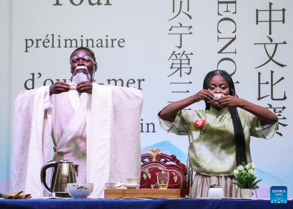 Contestants perform a tea ceremony during the 24th "Chinese Bridge" Chinese proficiency competition for Beninese college students at a Chinese cultural center in Cotonou, Benin, May 23, 2025. (Photo by Seraphin Zounyekpe/Xinhua)
