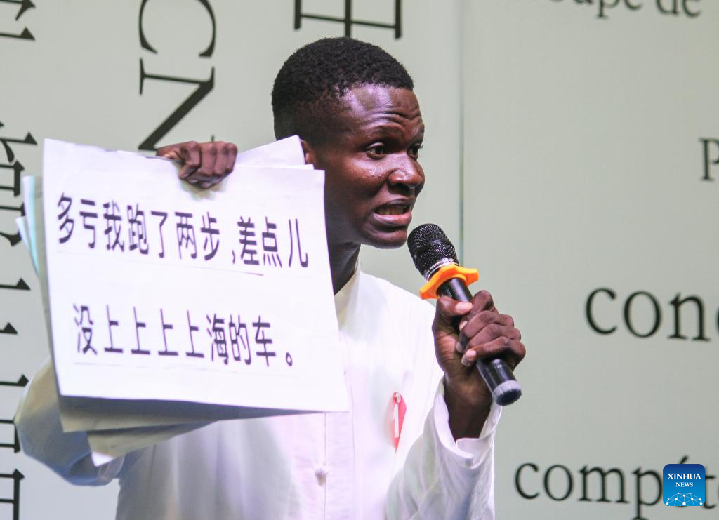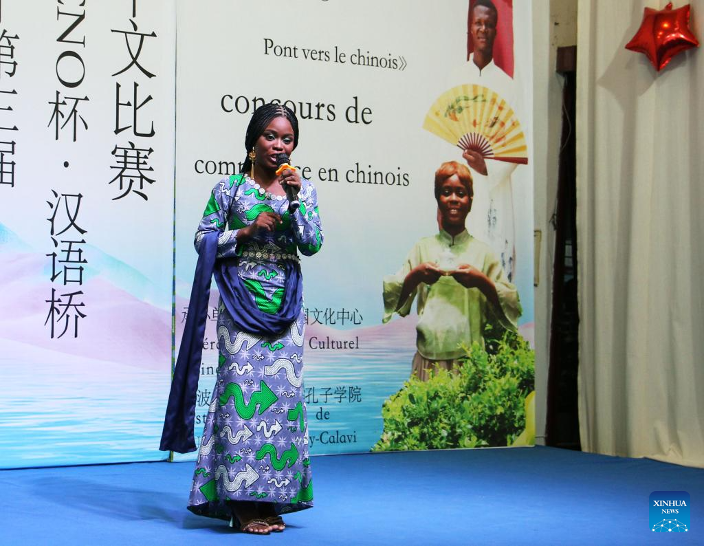 A contestant delivers a speech during the 24th "Chinese Bridge" Chinese proficiency competition for Beninese college students at a Chinese cultural center in Cotonou, Benin, May 23, 2025. (Photo by Seraphin Zounyekpe/Xinhua)