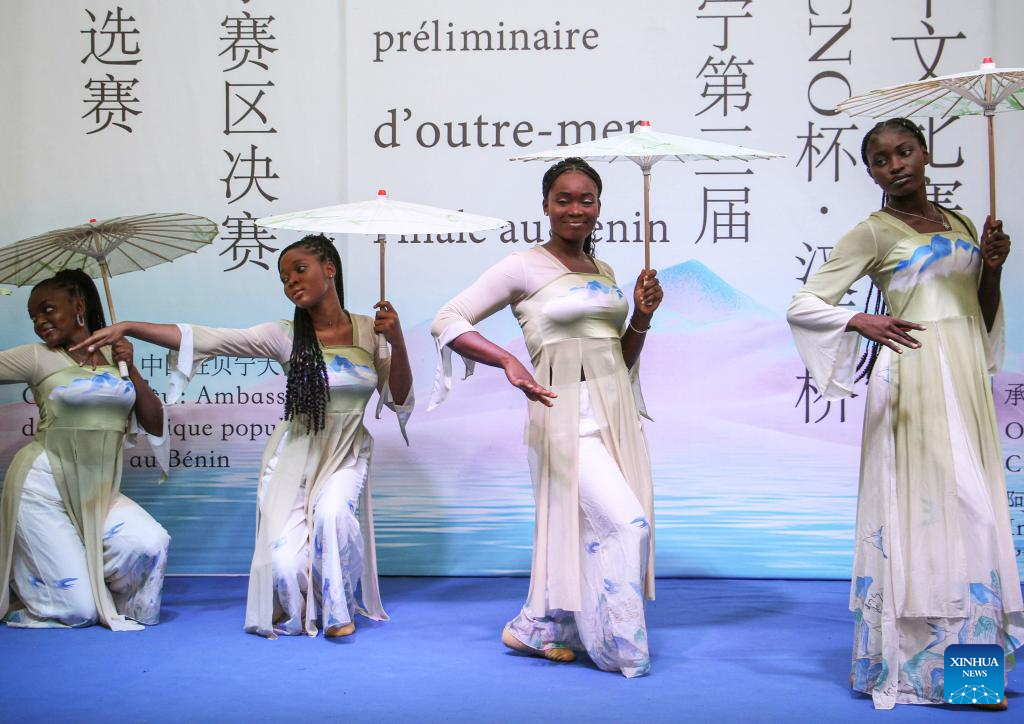 Contestants perform a dance during the 24th "Chinese Bridge" Chinese proficiency competition for Beninese college students at a Chinese cultural center in Cotonou, Benin, May 23, 2025. (Photo by Seraphin Zounyekpe/Xinhua)