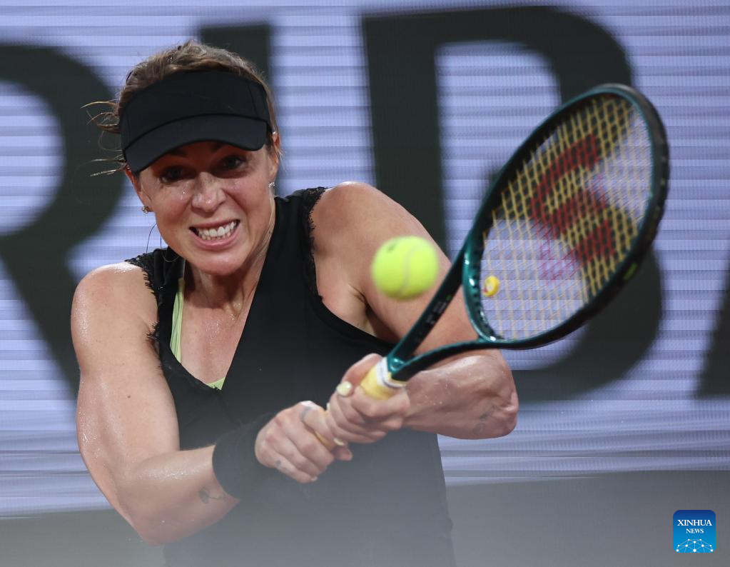Anastasia Pavlyuchenkova hits a return during the women's singles first round match between Anastasia Pavlyuchenkova of Russia and Zheng Qinwen of China at the French Open tennis tournament at Roland Garros, Paris, France, May 25, 2025. (Xinhua/Li Jing)