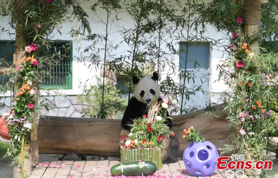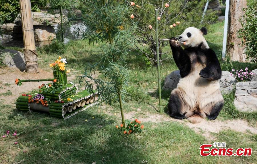 Giant panda Ya Ji enjoys a special cake to celebrate its 11th birthday at Jinan zoo in east China's Shandong Province, May 25, 2025. (China News Service/Zhang Yong)