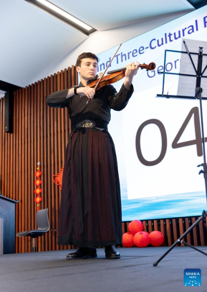 A contestant performs during the "Chinese Bridge" Chinese proficiency competition at the Charles Darwin University in Darwin, Australia, May 24, 2025. (Photo by Su Yunqi/Xinhua)