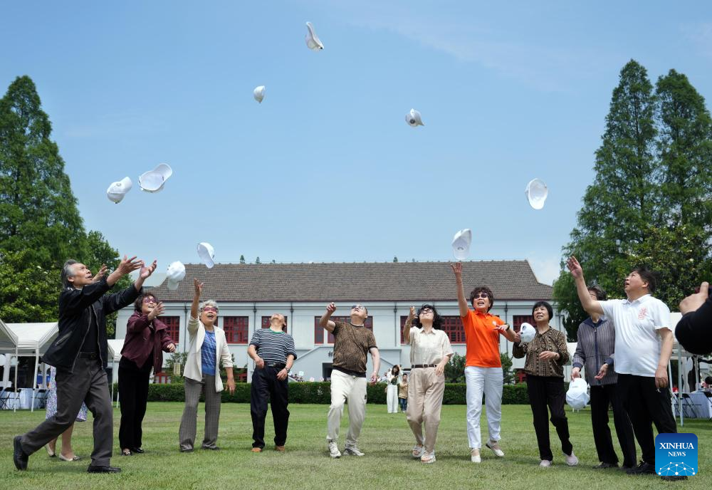 Alumni pose for photos on the campus of the Fudan University in Shanghai, east China, May 24, 2025. Founded in 1905, Fudan University is a comprehensive, research-oriented university based in Shanghai. (Xinhua/Liu Ying)