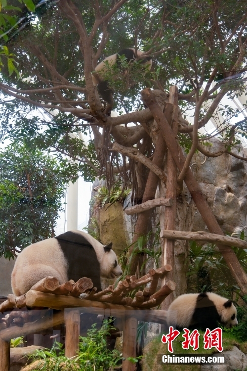 The female giant panda cub Jia Jia (R) and the male giant panda cub De De play with their mother Ying Ying at the Giant Panda Adventure area of the Ocean Park in the Hong Kong Special Administrative Region, May 27, 2025. (China News Service/Chen Yongnuo)