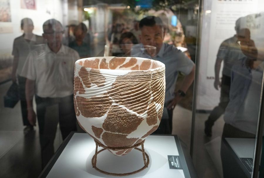 This photo taken on May 20, 2025 shows a zun, a type of Chinese ritual ceramic wine vessel with a vase-like form, displayed at the Dawenkou Site Museum in Tai'an, east China's Shandong Province. (Xinhua/Xu Suhui)