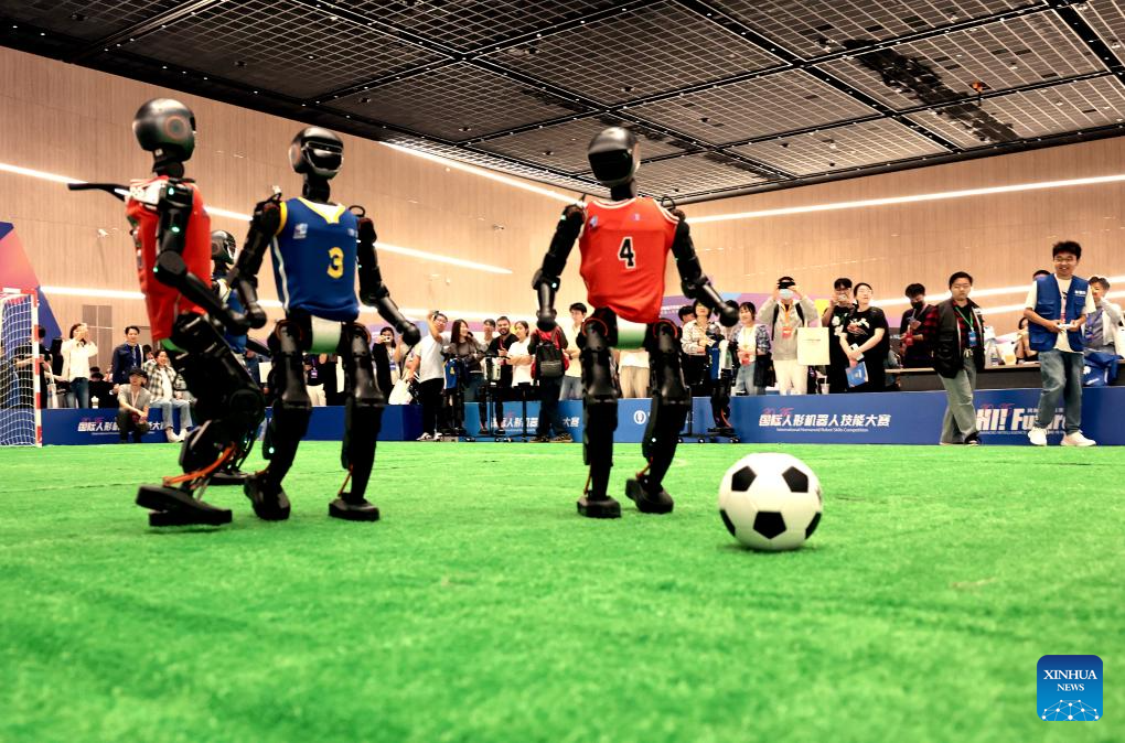 Robots "play" a football match during the 2025 International Humanoid Robot Skills Competition held at Zhangjiang Science Hall in Shanghai, east China, May 29, 2025. The 2025 International Humanoid Robot Skills Competition was launched in Shanghai on Thursday, focusing on industrial, household and commercial scenarios. Over 60 global teams competed in robot applications and core technology innovation. (Xinhua/Fang Zhe)