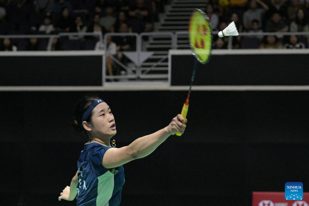 An Se-young of South Korea hits a return during the women's singles quarterfinal against Chen Yufei of China at the Singapore Badminton Open 2025 in Singapore, May 30, 2025. (Photo by Then Chih Wey/Xinhua)