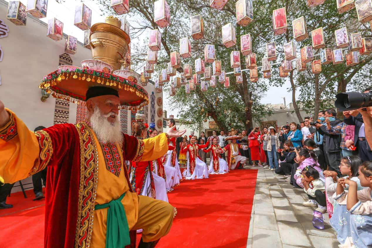 A traditional dance performance is staged in Qiuci Lane, Kuqa, northwest China's Xinjiang Uygur Autonomous Region to welcome tourists. (Photo by Yuan Huanhuan/People's Daily Online)