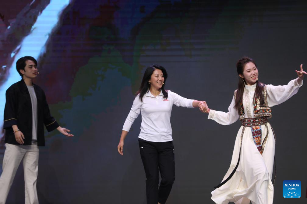 China's former Winter Olympic champion Yang Yang (C) and guests give a themed demonstration at the opening ceremony of the fourth Dialogue on Exchanges and Mutual Learning among Civilizations in Dunhuang, northwest China's Gansu Province, May 30, 2025. The fourth Dialogue on Exchanges and Mutual Learning among Civilizations kicked off here on Friday. About 400 people attended the meeting, including political leaders, scholars, and heads of international organizations and non-governmental organizations from multiple countries. (Xinhua/Zhang Rui)