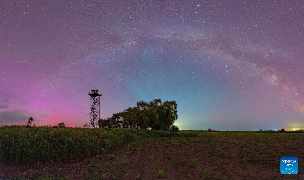This stitched photo taken on June 1, 2025 shows a view of aurora and the Milky Way in Fujin City, Jiamusi City, northeast China's Heilongjiang Province. (Photo by Qu Yubao/Xinhua)