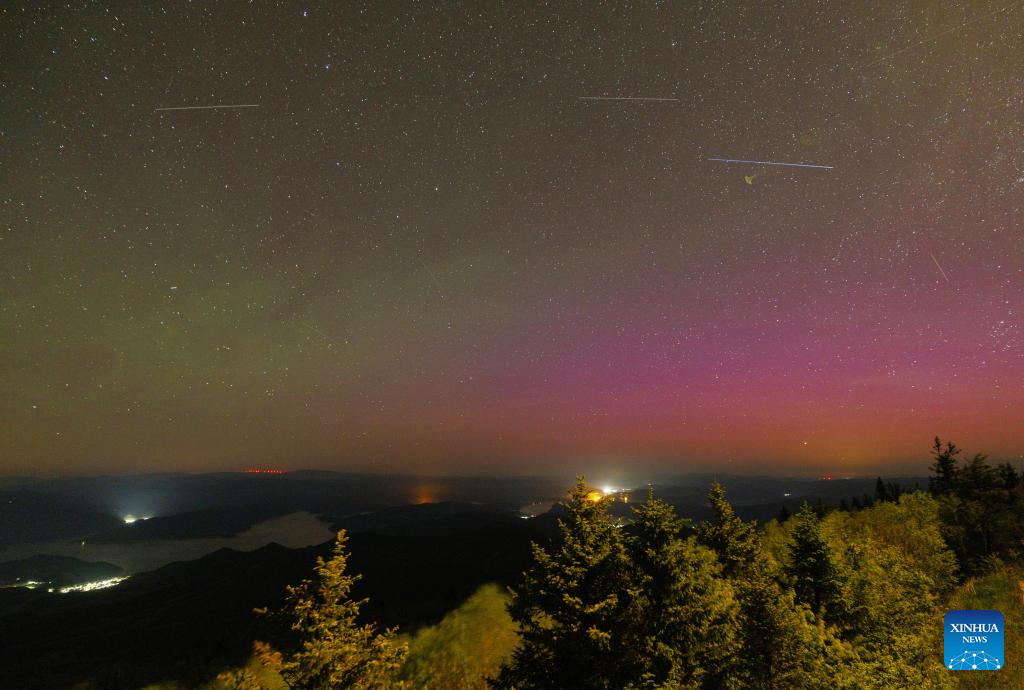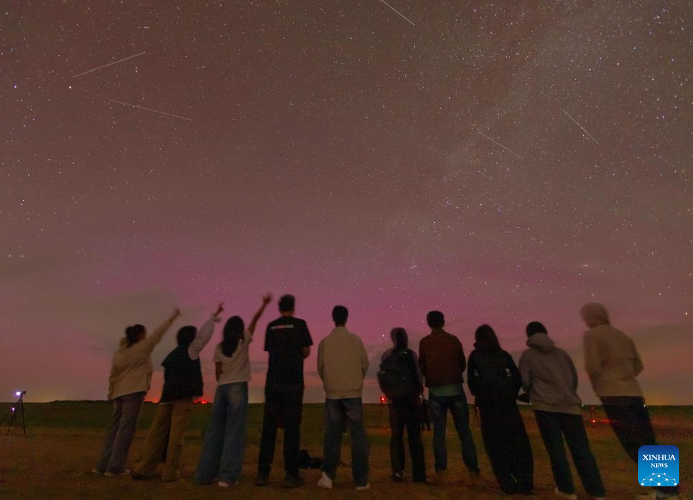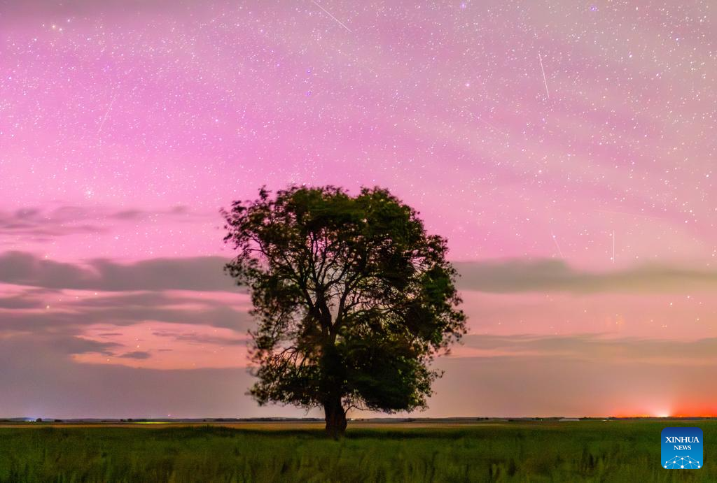 This photo taken on June 1, 2025 shows a view of aurora and a dashing meteor in Jixian County of Shuangyashan City, northeast China's Heilongjiang Province. (Photo by Han Yang/Xinhua)