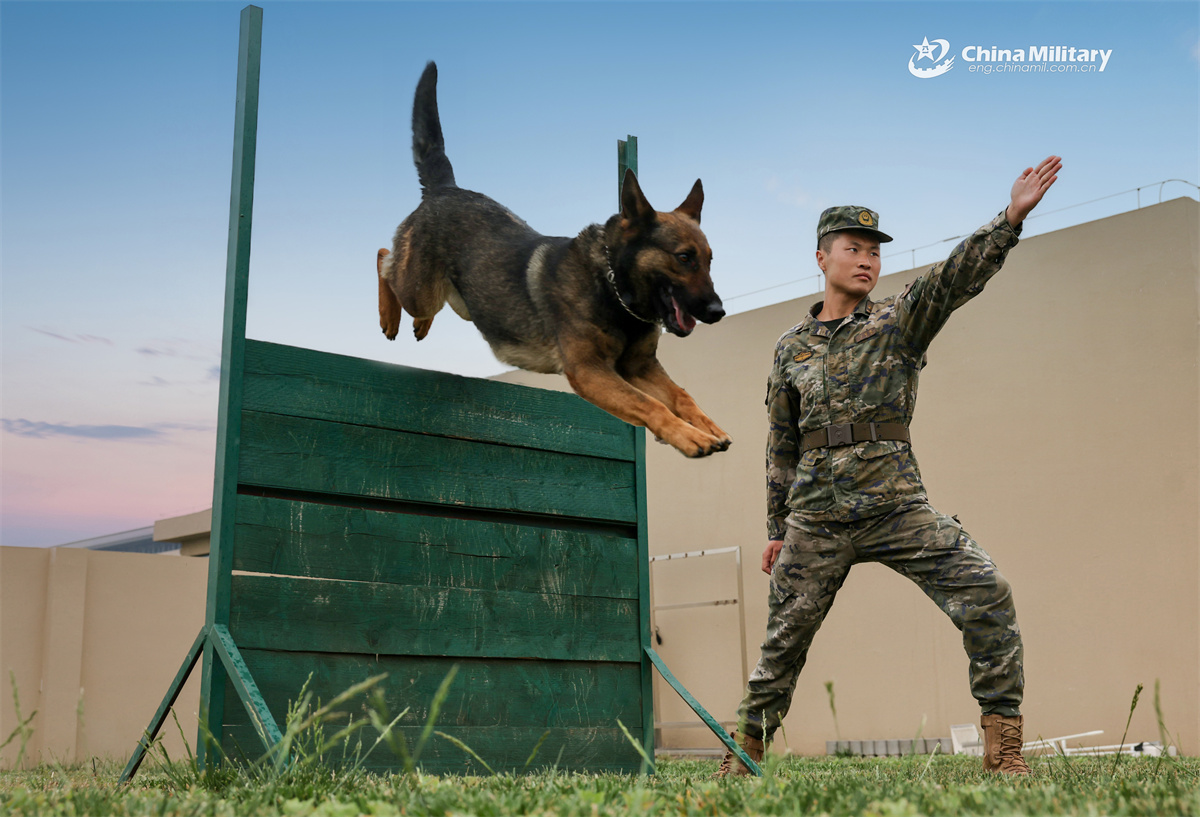 A soldier assigned to the 1st Mobile Corps of the Chinese People's Armed Police (PAP) Force commands his military working dog to jump over an obstacle during a training exercise on May 22, 2025. (eng.chinamil.com.cn/Liao Naixing and Ti Zhangfeng)