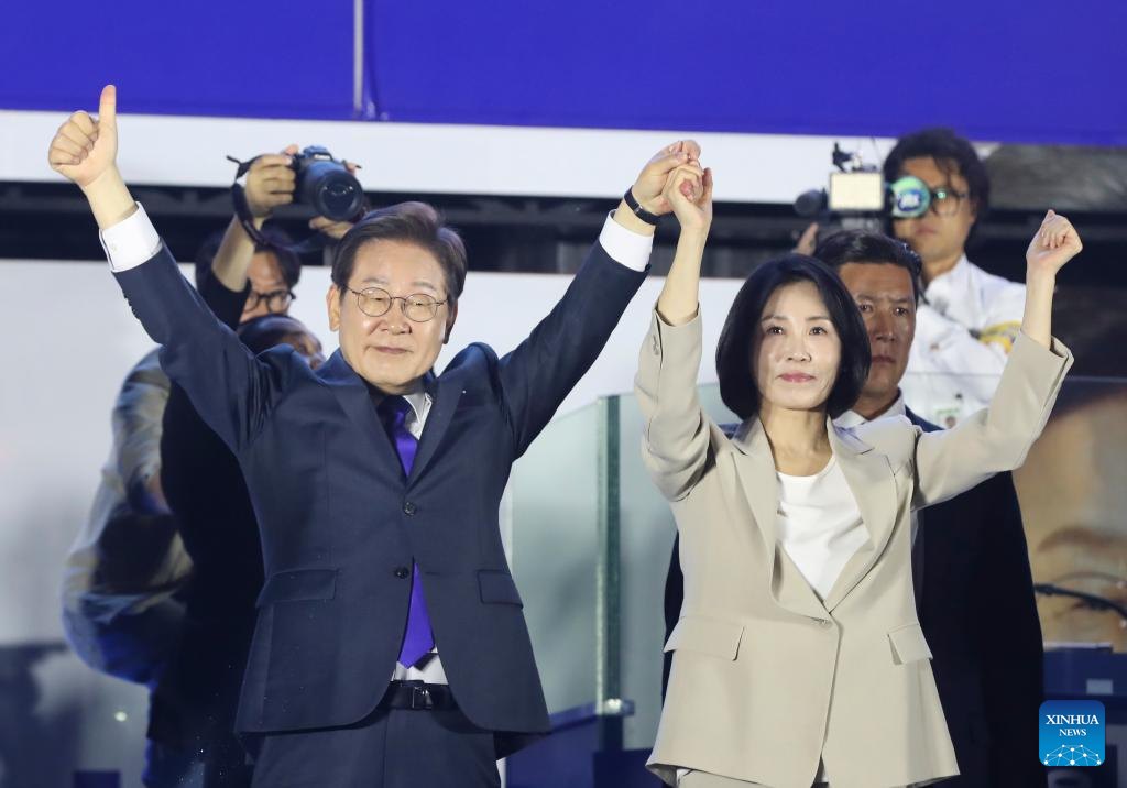 Lee Jae-myung and his wife Kim Hye-kyung celebrate at the National Assembly in Seoul, South Korea, on June 4, 2025. Lee Jae-myung of South Korea's majority liberal Democratic Party was elected president, the ongoing vote count by the National Election Commission showed on Wednesday. (Xinhua/Yao Qilin)