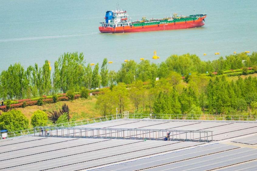 Photovoltaic panels are installed atop a factory building along the Yangtze River in Ma'anshan, east China's Anhui Province. (Photo by Zhang Mingwei/People's Daily Online)