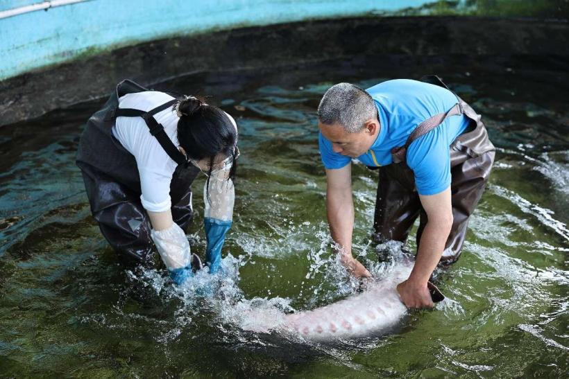 Staff members at a conservation base for rare fish of the Fisheries Institute of Sichuan Academy of Agricultural Sciences inspect the health of a Yangtze sturgeon in the upper reach of the Yangtze River. (Photo by Zhang Baolin/People's Daily Online)