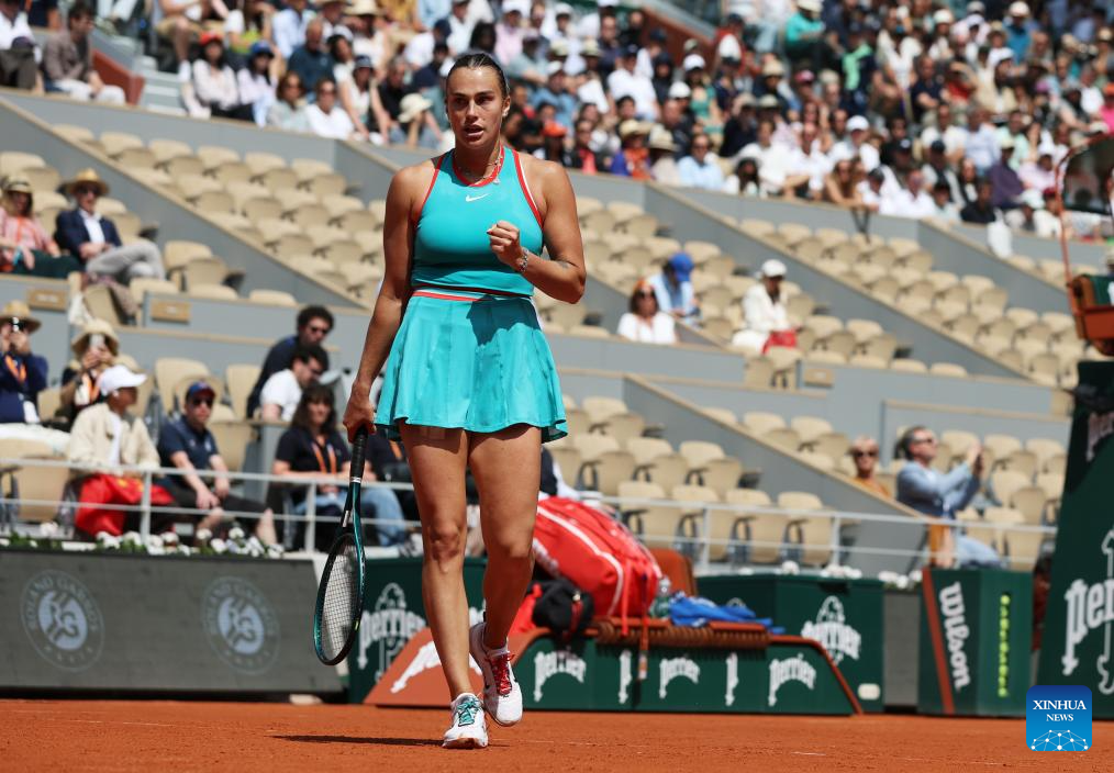 Aryna Sabalenka celebrates scoring during the women's singles quarterfinal between Zheng Qinwen of China and Aryna Sabalenka of Belarus at the French Open tennis tournament at Roland Garros, Paris, France, June 3, 2025. (Xinhua/Gao Jing)