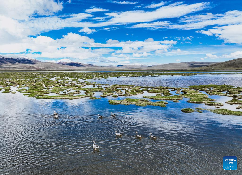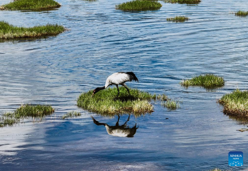 According to monitoring data of May this year, 37 species of birds including bar-headed geese and black necked cranes inhabited here. (Photo by Du Xiaowei/Xinhua)