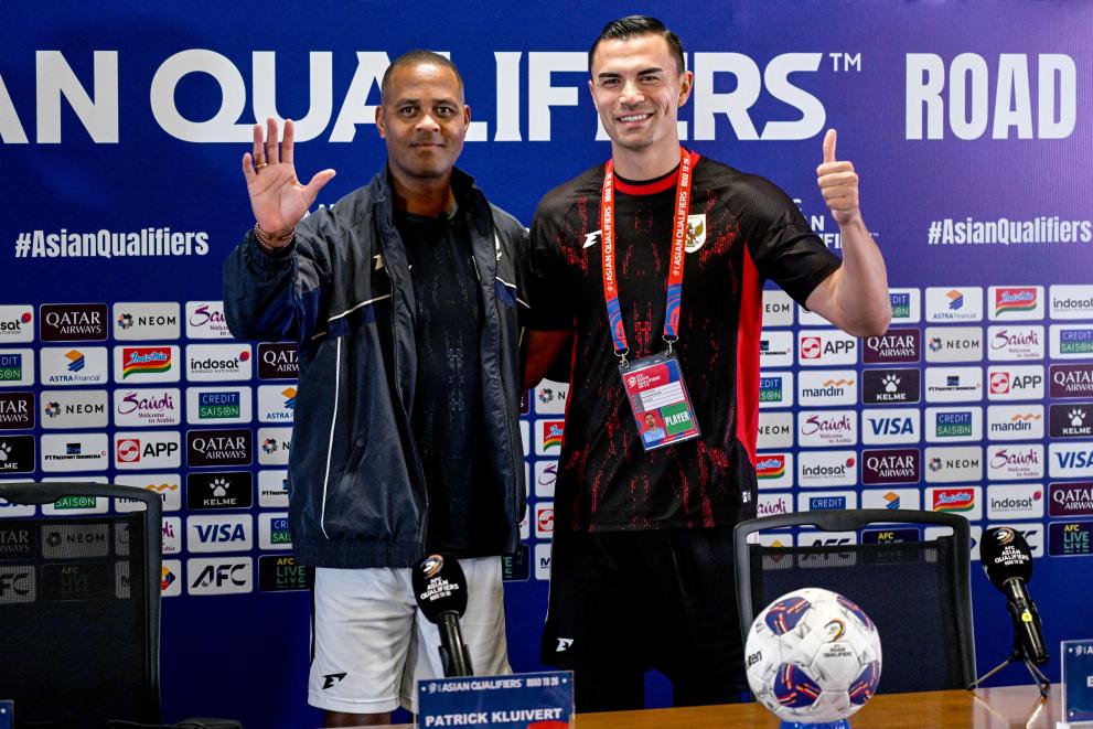Indonesia's head coach Patrick Kluivert (L) and player Emil Audero pose for photos after a press conference in Jakarta, Indonesia, June 4, 2025, one day ahead of the 2026 FIFA World Cup Asian Qualifiers Group C match between China and Indonesia. (Xinhua/Agung Kuncahya B.)