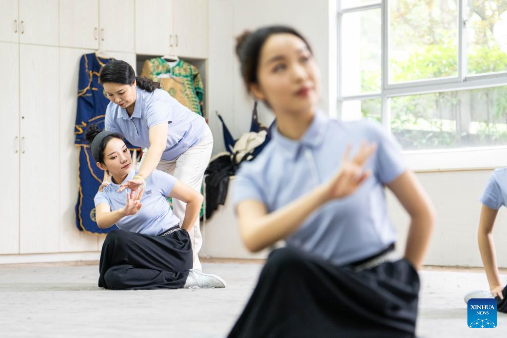 Actress Wang Limei (R, front) helps a young actress take basic training at the practice room of the Hunan Kunqu Opera Troupe in Beihu District of Chenzhou City in central China's Hunan Province, June 4, 2025.